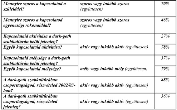 Kapcsolatok terén mennyiségi csökkenésről és minőségi javulásról számolnak be a válaszadók. Legtöbbjüknek szüleivel igen szoros a köteléke, egyéb kapcsolataik aktívak és mélyek. Hipotézisemmel összhangban a dark-goth szubkultúrán belüli viszonyaik aktivitását 73% passzívnak vagy inkább passzívnak, mélységét tekintve 63% felületesnek vagy inkább felületesnek ítélte. Aktív és mély személyközi kapcsolataik főleg a szubkultúrán kívüli egyénekkel vannak, ami nem véletlen, mivel a 88%-os aktív vagy inkább aktív 2002/03-as szubkulturális részvétel, 36%-osra csökkent.