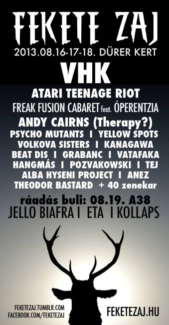 Bár az idei Fekete Zaj Fesztivál helyszíne megváltozott a korábbiakhoz képest, vannak azért fix pontok: ilyen a VHK koncertje, hiszen Grandpierre Atilla és zenekara ezúttal is játszik a fesztiválon, augusztus 17-én, méghozzá idén utoljára a fővárosban. Előttük és utánuk a magyar underground klubélet meghatározó bandái játszanak, köztük a Psycho Mutants, az Alba Hyseni Project, a Kobza Vajk Group (a német Thomas Gundermannal kiegészülve), a Pozvakowski és a The Moon and the Nightspirit. Az este végén a nagyteremben az „orosz Dead Can Dance”, azaz a Theodor Bastard zenél.
